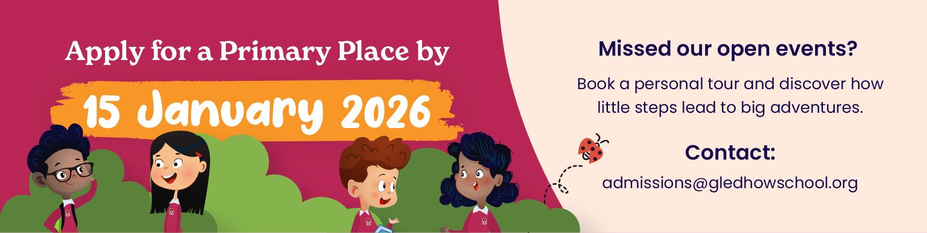 - Applications for a place in reception after the start of term in September 2025 (Due to movement during the school holiday we have a few places available to start in September 2025, contact us at admissions@gledhowschool.org)